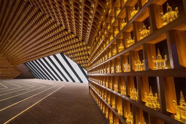 映入眼簾的便是“千年對(duì)望”的時(shí)空長廊,踏上步道,腳下七步生蓮,立柱搖鈴輕響,空氣中還有熏香的味道。而長廊盡頭,是玄奘法師面對(duì)著佛陀微笑。