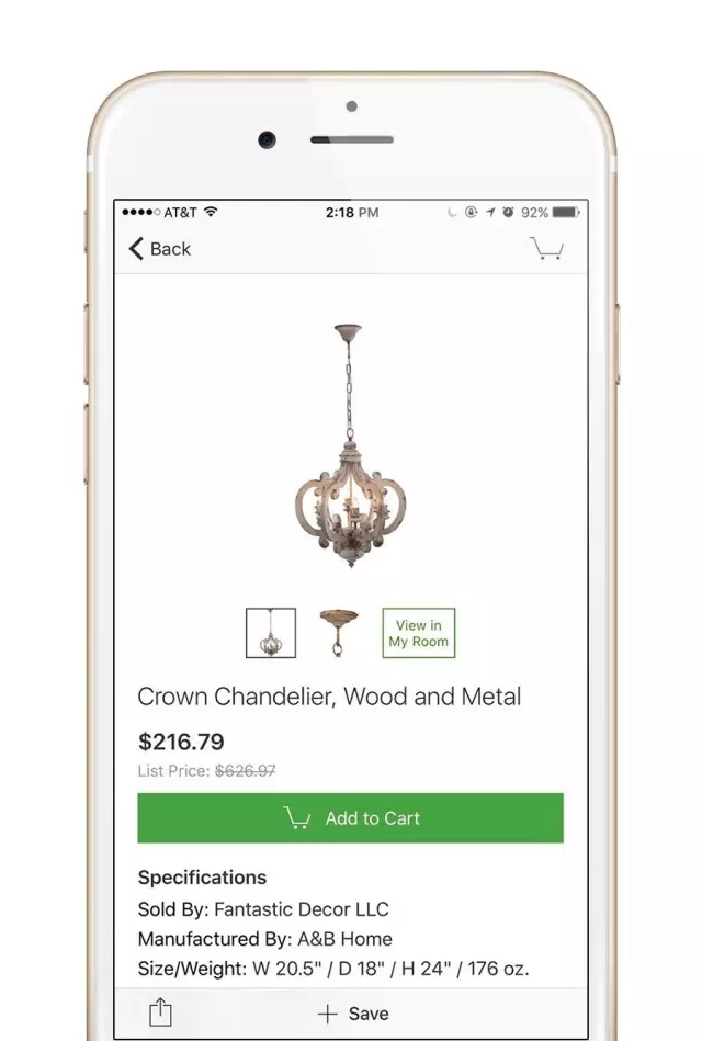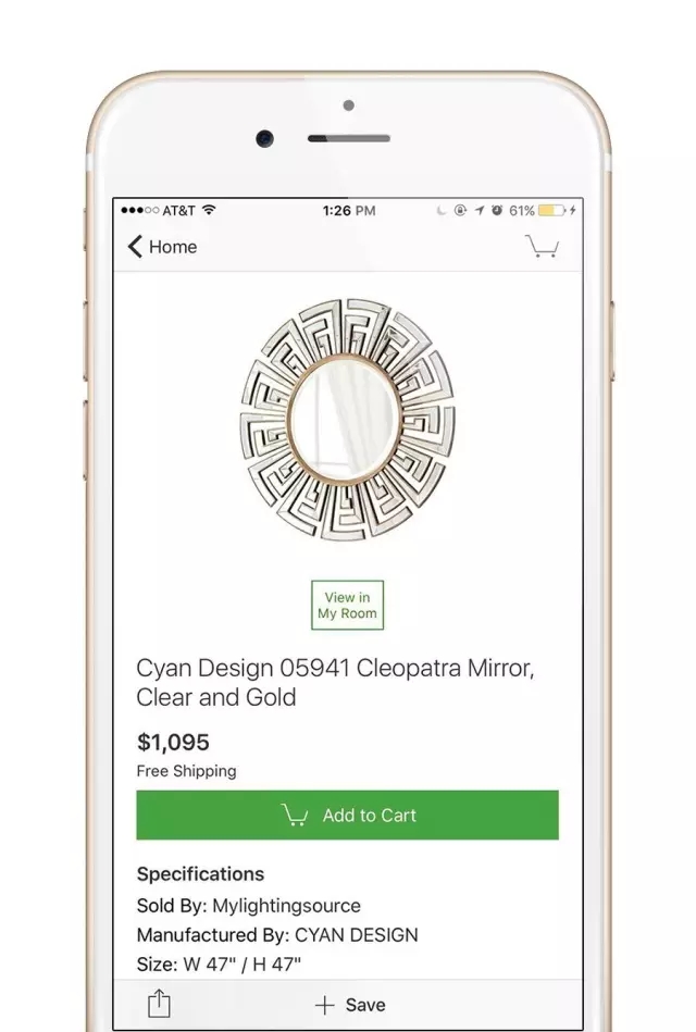點(diǎn)擊“View in My Room”后,家具就會(huì)以插圖的形式呈現(xiàn),自動(dòng)切換到相機(jī),你可以挪動(dòng)家具圖片的位置、改變它的大小,拍一張照,就可以看看這個(gè)家具在你想要的環(huán)境中的效果啦。