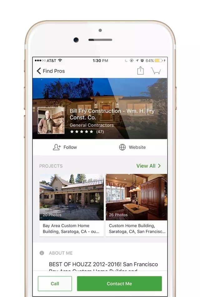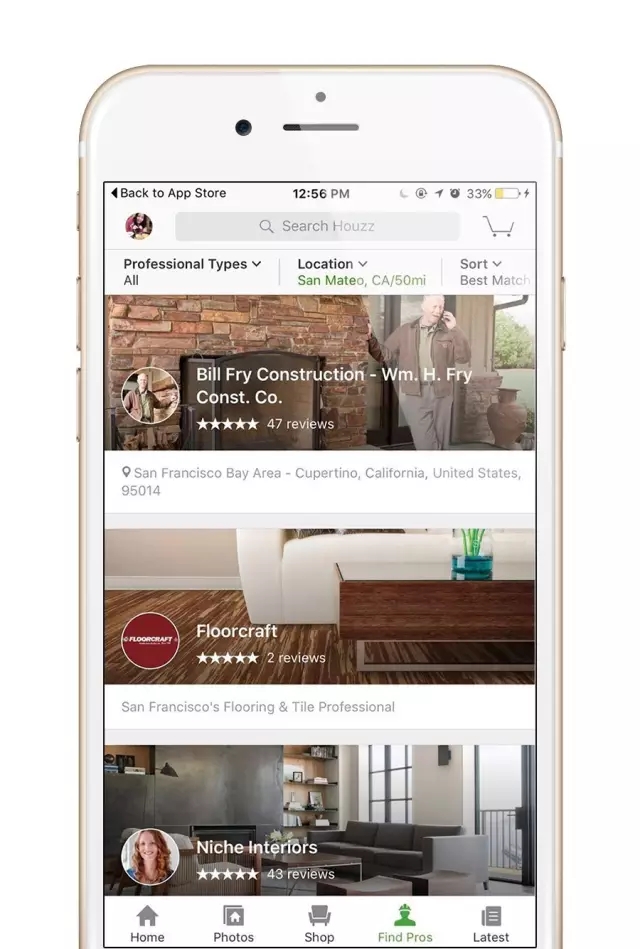 Houzz的社區(qū)屬性體現(xiàn)在幫你對接優(yōu)秀設(shè)計(jì)師上。在“Find Pros”一欄中,你可以看到你周邊的設(shè)計(jì)師們,比如第一個(gè)有47個(gè)評價(jià)的五星老爺爺設(shè)計(jì)師~