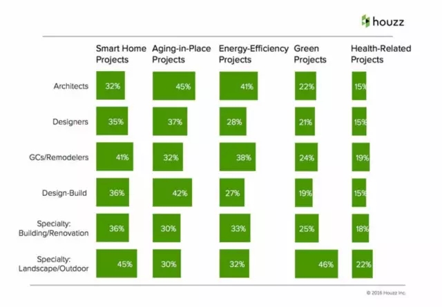 根據(jù)他們的數(shù)據(jù),廚房和衛(wèi)生間的家裝項(xiàng)目增長明顯,而且人們對于智能家居項(xiàng)目以及與適配老年人生活的項(xiàng)目要多于其他項(xiàng)目(節(jié)能設(shè)備項(xiàng)目、環(huán)保項(xiàng)目、健康相關(guān)項(xiàng)目)。