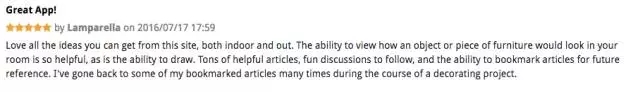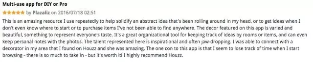“這是一個(gè)非常棒的軟件,我用它幫助我實(shí)現(xiàn)我腦海里的抽象的想法。當(dāng)我不知道從哪開始或者購買我之前在哪都找不到的東西時(shí),它會(huì)幫我找到一個(gè)想法。這個(gè)APP的裝飾很漂亮,有些東西可以很好地符合大眾口味。這是一個(gè)很好的以你想法并通過不斷追蹤你房間或者物品來安置物品的工具,并且可以保存用戶筆記的照片。這里比較驚艷的是具有啟發(fā)性或者往往讓你驚掉下巴的想法。 我曾經(jīng)給一位室內(nèi)裝修的設(shè)計(jì)師看我在Houzz上的一塊區(qū)域后,她表示很驚訝。每當(dāng)我開始瀏覽這個(gè)軟件的時(shí)候我總會(huì)忘記時(shí)間。很多東西可以說,我極力推薦Houzz?!?/p>