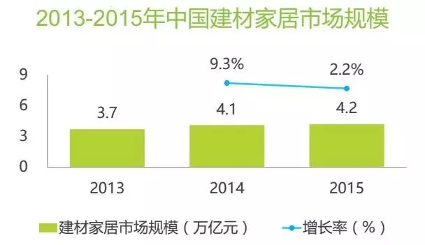 2015年我國(guó)建材家居市場(chǎng)規(guī)模達(dá)4.2萬億元。該行業(yè)互聯(lián)網(wǎng)滲透率僅為4.0%,有較高的增長(zhǎng)空間,預(yù)計(jì)互聯(lián)網(wǎng)家裝會(huì)繼續(xù)保持增長(zhǎng)態(tài)勢(shì)。