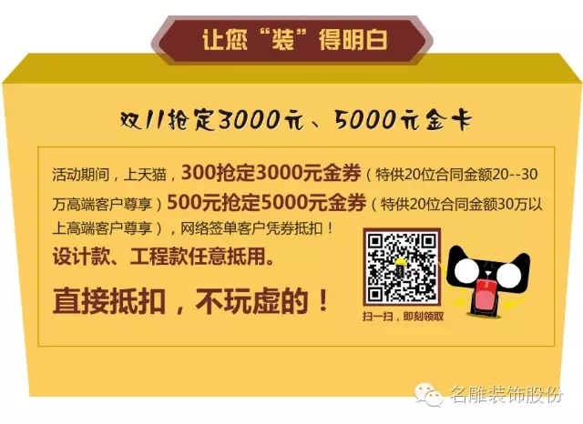 第二種是活動促銷套路,有些家裝公司會搞各種營銷優(yōu)惠,看上去折扣的力度很大,其實到頭來并不見得是優(yōu)惠,后期還可能通過其他手段增加費用。而這一次我們推出了天貓金券,在活動期間上我們的天貓旗艦店,就有機會搶定3000元、5000千元的金券,兩種金券各限量20位,只要搶到金券便能任意抵用設(shè)計款、工程款。這也是名雕今年優(yōu)惠力度最大的網(wǎng)絡(luò)活動,恰逢雙十一,我們也想給到我們客戶更優(yōu)性價比的家裝服務(wù)體驗。(轉(zhuǎn)載自新浪家居)