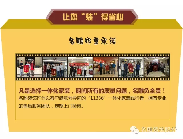 名雕11356一體化服務(wù)體系,就是我們撕開家裝品質(zhì)套路的最強有力的武器。第一個“1”是名雕的核心價值觀——客戶滿意;第二個“1”代表名雕的一體化服務(wù);“3”是一體服務(wù)的三大優(yōu)點;“5”是我們的五大服務(wù)流程,“6”則對應(yīng)我們六大承諾。此次活動我們也會將11356一體化服務(wù)貫徹到底,切切實實保障業(yè)主的裝修利益。