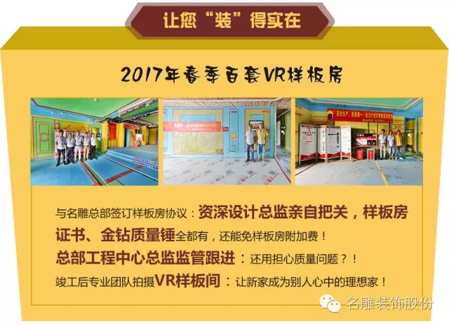 為了保證工程品質(zhì),我們嚴格執(zhí)行108項驗收標準,保證每一個工程都是金鉆品質(zhì)。這次的活動我們將金鉆工程與當(dāng)下非常熱門的VR相結(jié)合,推出2017年春季百套VR樣板房征集活動,并由名雕總部工程總控中心全程跟進,頒發(fā)樣板房證書以及金鉆質(zhì)量錘,業(yè)主只要覺得哪里不滿意便可砸掉重來,杜絕家裝中的品質(zhì)套路。