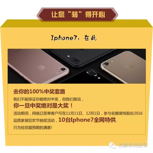 這10臺iPhone7是為我們網(wǎng)絡(luò)簽單客戶而準備的,不過整個抽獎活動是有時間節(jié)點的,只有在11月1日以后通過我們網(wǎng)絡(luò)平臺簽單的客戶,才有機會在11月11以及12月1日當(dāng)天抽取大獎。同樣的,獎品我們也不玩套路,中獎直接就是iPhone 7,我們不設(shè)置小獎來充數(shù)。(轉(zhuǎn)載自新浪家居)