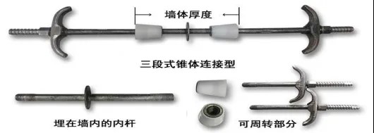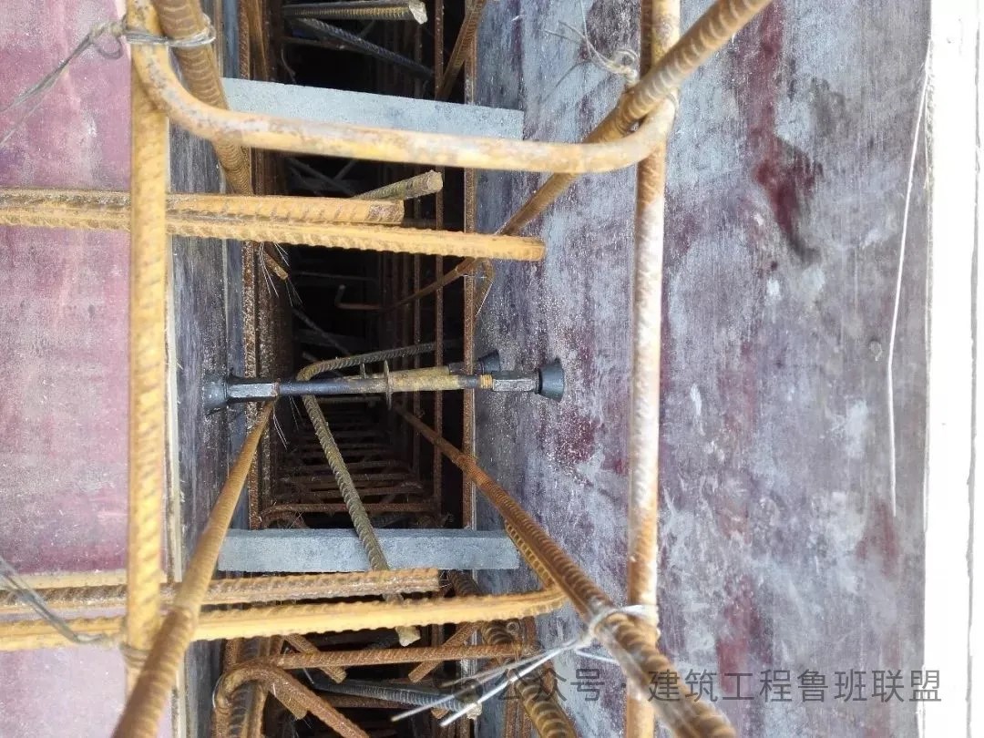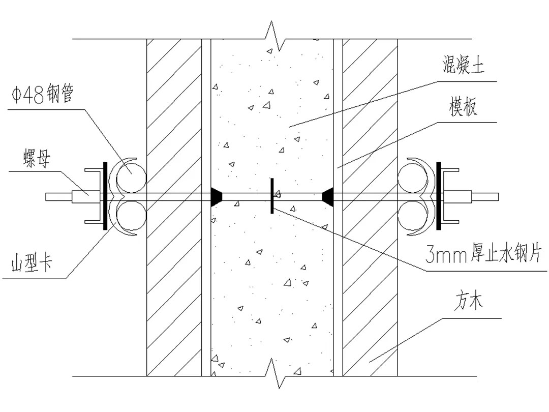 對拉螺桿多用于豎向構件模板的加固桿件,另兩端均配設固定件(山形帽或成品鐵板墊塊)和螺帽限位,起到固定模板的效果。目前市場螺桿的種類繁雜,一般用于房建工程的螺桿均采用Q235的圓鋼進行滾絲制作,直徑為M14(鋁模除外,其采用Tr18型),長度根據(jù)相應墻厚進行配設。根據(jù)豎向結構防水要求將螺桿主要分為通絲螺桿和止水螺桿。