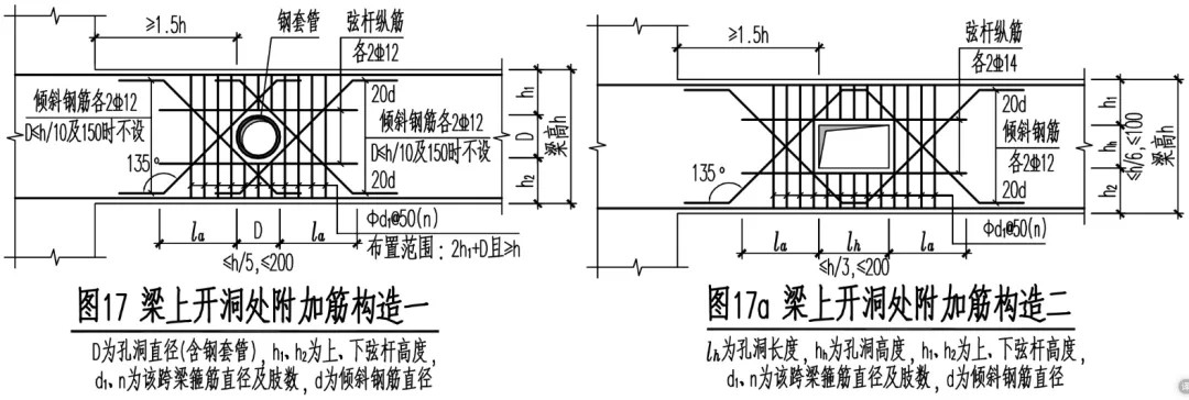 梁上開洞,因為改變了梁受力特性,因此必須采用附加筋補強措施,設計進行力學計算后出具大樣圖,嚴格依圖施工。某項目水管和風管穿梁開洞構(gòu)造示意圖: